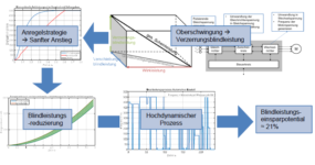 Frequenzumrichter als eine typische nichtlineare Komponente ist u.a. die Hauptursache von der Entstehung der Oberschwingungen in WZM. Generell verfügen Anfahrtssignale in WZM über eine Rampenform oder eine leicht aufgeweichte Rampenform. Mit Hilfe von Zeitverzögerungselementen (PT-Glieder) werden die Anfahrtssignalkurven von Startzeitpunkt bis zum Erreichen der Zieldrehzahl ohne sprunghafte Änderung geglättet. Infolgedessen entstehen im Frequenzbereich weniger Oberschwingungen des Basissignals des drehenden Motors. Dazu ist es steuerungsseitig notwendig das von der SPS ausgesendetes Anfahrtssignal der Motordrehzahl anzupassen. Es ist keine zusätzliche Software oder Hardware nötig. Als Ergebnis konnten wir erreichen, dass die Blindleistung um bis zu 21% reduziert und die zur Verfügung gestellte Wirkleistung um bis zu 12% gesteigert werden konnte.