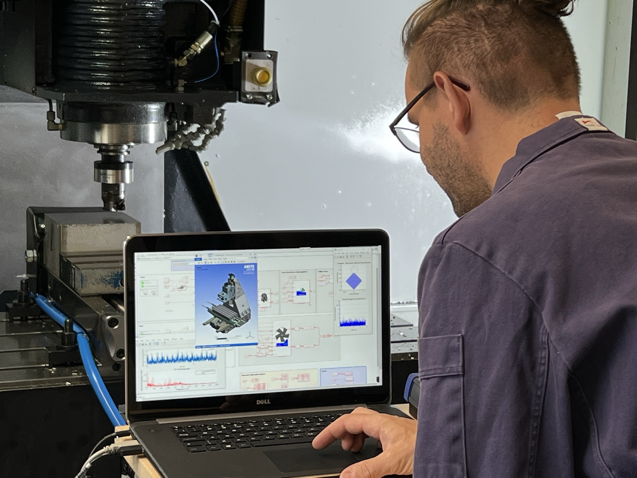 Die Forschungsarbeit konzentriert sich auf die Entwicklung eines digitalen Zwillings am Beispiel einer Fräsmaschine mit integriertem Prozess- und Antriebsmodell. Hierbei werden das werkstück- und werkzeug-bezogene Prozessverhalten, die mechanischen Eigenschaften der Maschinenstruktur sowie das nichtlineare kaskadengeregelte Verhalten der elektrischen Antriebe integriert betrachtet und analysiert. Das Korrelationsverhältnis zwischen dem dynamischen Verhalten des Fräsprozesses und dem Regelungszustand der E-Motoren konnte durch die Nutzung des etablierten digitalen Zwillings abgeleitet werden.