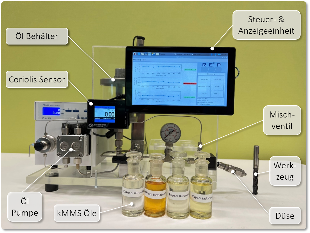 Das entwickelte einkanalige kMMS-Mischsystem basiert auf dem Einsatz von flüssigem unterkritischen CO2. Die Dosierung der Medien ermöglicht die unabhängige Einstellung der Kühl- und Schmierleistung in Abhängigkeit der Werkstoff-Schneidstoff-Paarung. Hierbei können Produktivitäts- und Standzeitpotenziale gehoben und Prozesse aufgrund längerer Werkzeugstandzeiten nachhaltiger gestaltet und Herstellungskosten gesenkt werden. Die tiefen Temperaturen des CO2 erlauben die Herstellung von trockenen und kontaminationsarme Werkstücken, deren Bearbeitung aktuell nur trocken und oftmals nicht wirtschaftlich möglich ist.
