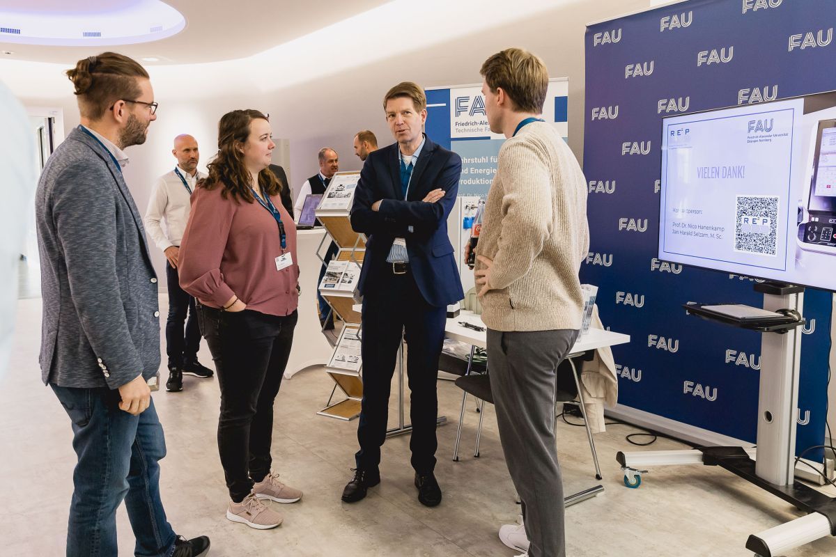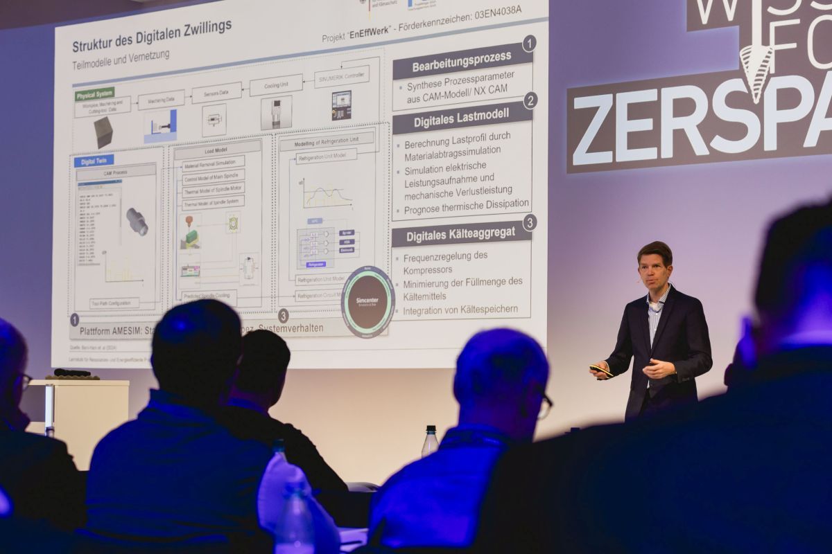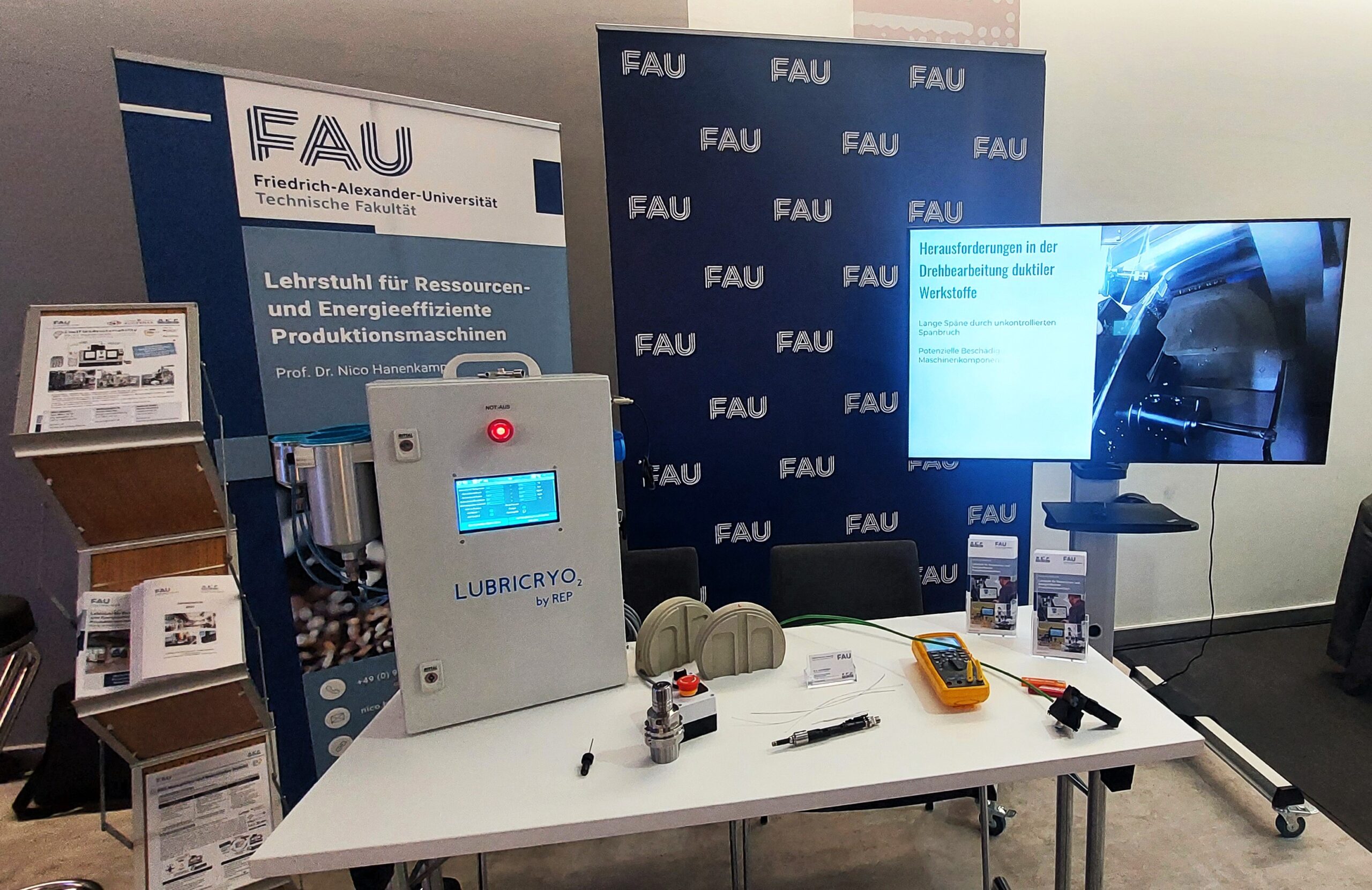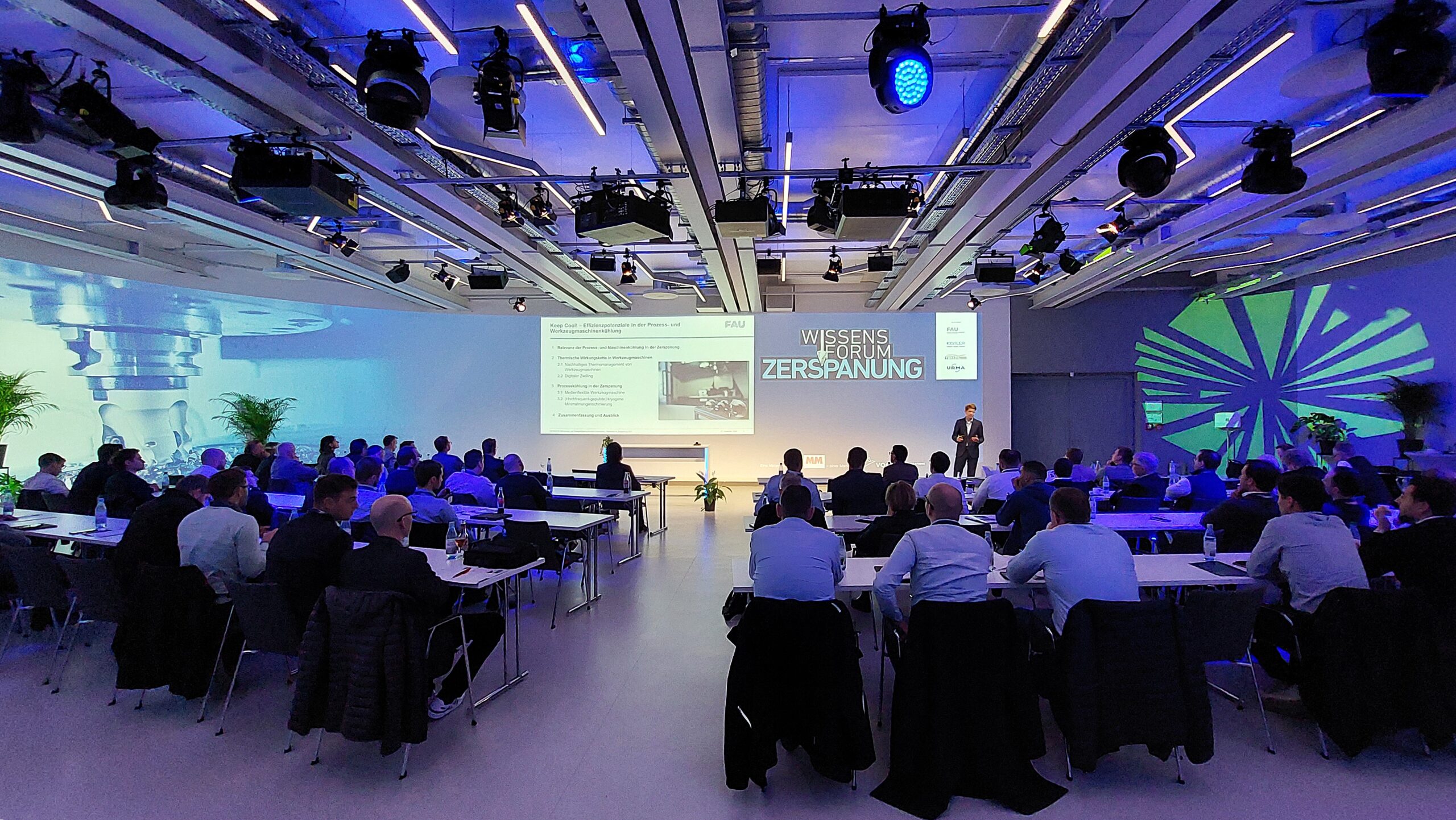 Am 27. November war der Lehrstuhl für Ressourcen- und Energieeffiziente Produktionsmaschinen erneut beim Wissensforum Zerspanung des MM Maschinenmarktes in Würzburg vertreten. Wie im letzten Jahr waren auch dieses Jahr wieder hochrangige Unternehmen und renommierte Universitäten zu Gast. Im Rahmen der Vorträge sowie der Ausstellung wurden innovative und neuartige Verfahren zur Optimierung der Zerspanungsprozesse präsentiert. Von Seiten des Lehrstuhls REP nahmen Prof. Hanenkamp, Trixi Meier, Jan Reichinger, Andreas Röckelein, Jan Selzam, Mario Stange, Stefan Ziehr sowie einige Studierende an der Veranstaltung teil. Im Zuge der Ausstellung wurden seitens des Lehrstuhls REP die aktuellen Forschungsprojekte im Bereich Kühlschmierstoffe (DiaCool) und kryogener Zerspanung (KryoPuls, CoolFlex4sustainability, ProKos und DiaThermoCool) vorgestellt. Prof. Nico Hanenkamp zeigte in seinem Vortrag „Keep Cool! – Effizienzpotenziale in der Prozess- und Werkzeugmaschinenkühlung“ die Relevanz der Prozess- und Maschinenkühlung in der Zerspanung, die thermische Wirkungskette in Werkzeugmaschinen sowie die Wichtigkeit der Prozesskühlung durch ressourcenschonende KSS-Strategien.